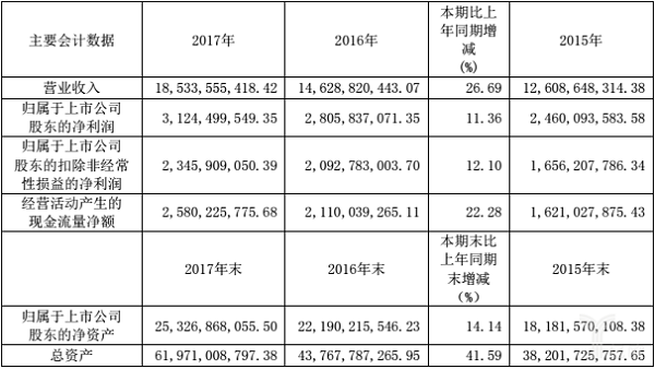 523日,复星医药披露了2017年年度报告。报告显示,公司2017年营业收入约为185.34亿元,较上年同期增长26.69%;归属于上市公司股东的净利润约为31.24亿元,较上年同期增长11.36%。具体数据参照下表: