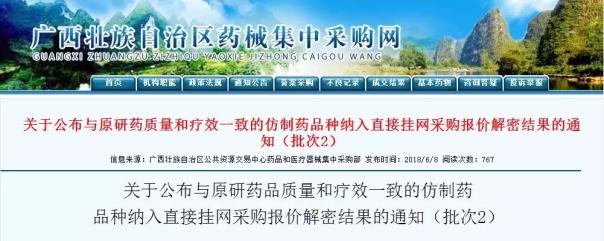 近日,广西省药械采购网发布《关于公布与原研药质量和疗效一致的仿制药品种纳入直接挂网采购报价解密结果的通知(批次2)》。
