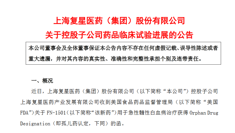 1128日,复星医药发布公告称,控股子公司上海复星医药产业发展有限公司收到美国食品药品监督管理局(以下简称“美国FDA”)关于FN-1501(以下简称“该新药”)用于急性髓性白血病治疗获得Orphan DrugDesignation(即孤儿药认定,下同)的函。