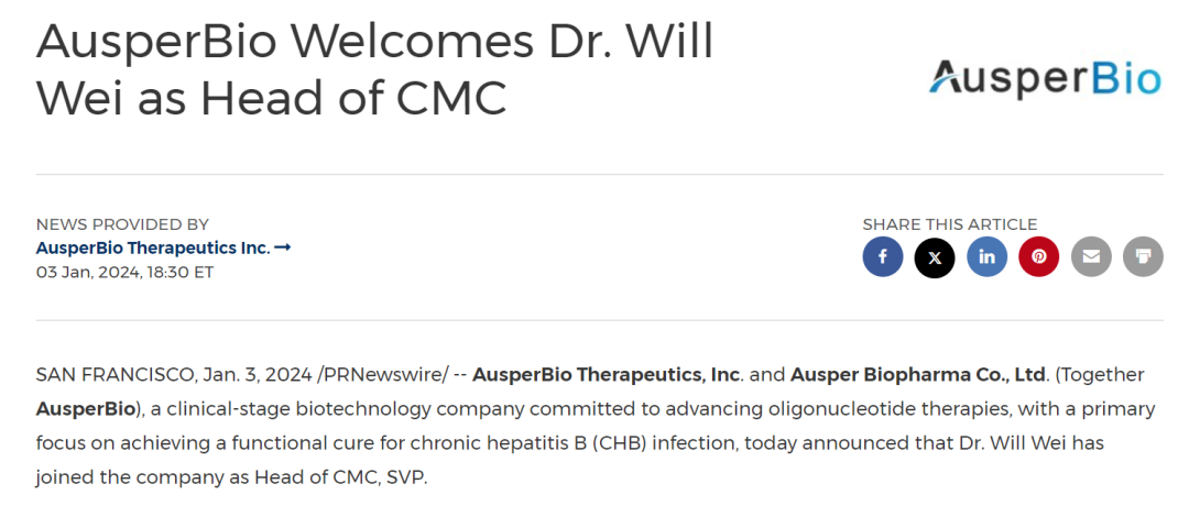 1月3日,致力于研发FIC和BIC自主创新的慢性乙型肝炎(CHB)感染的治愈药物公司——浩博医药AusperBio(Ausper Biopharma Co.,Ltd.和AusperBio Therapeutics,Inc.)(以下简称“AusperBio”)宣布魏恒旭博士自2023年12月15日起担任高级副总裁兼CMC负责人。