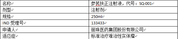我们来看看这个获得临床批件的药品是什么来头。参芪扶正注射液是由丽珠集团利民制药厂研究开发的二类中药新药。在1999年11月,参芪扶正注射液获得CFDA生产批文(国药准字Z19990065号),主要用于益气扶正;对由肺脾气虚引起的神疲乏力,少气懒言,自汗眩晕以及肺癌、胃癌见上述证候者的治疗有辅助作用。该中药注射液属于中药保护品种并纳入国家医保目录。根据IMS数据显示,2017年度,参芪扶正注射液实现销售收入约为人民币15.73亿元,且2017年度在国内抗肿瘤中药注射剂医院销售的市场份额占比约为13.66%。
